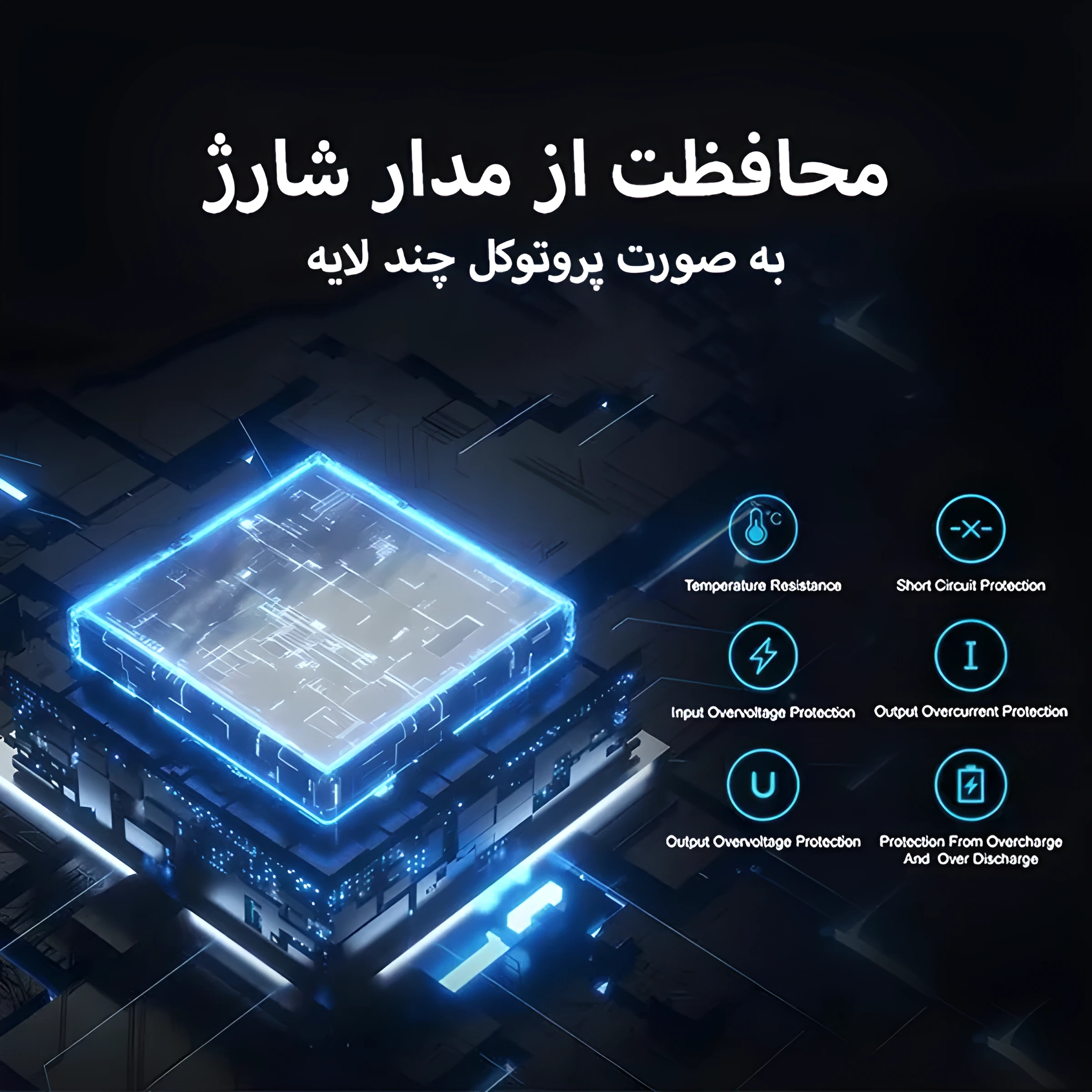 دارای مکانیزمهای محافظتی در برابر اضافهبار، افزایش دما، اتصال کوتاه و ولتاژ بالا.